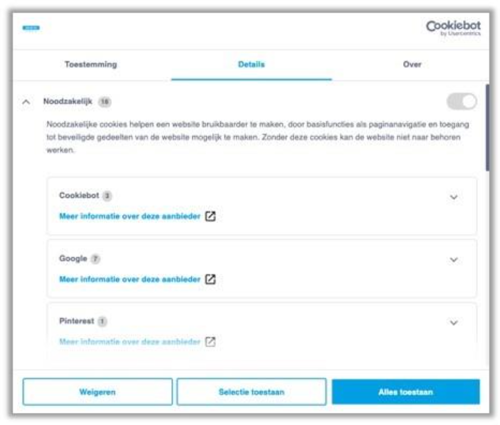 Door op aanpassen te klikken kunt u de cookie-instellingen wijzigen. Tevens zie u op deze pagina ook extra toelichting per type cookie die gemeten wordt op de website. Hier heeft u ook de mogelijkheid om uw voorkeuren door te geven. Een voorbeeld van deze weergave treft u hieronder.